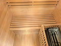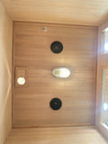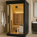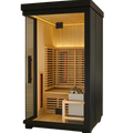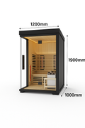 Snygg och kompakt hemmabastu med svart utsida och ljus träinredning. Fronten är i härdat glas med fullhöjd och ett solidt grepp, och inuti får du en bekväm bänk, integrerad LED-stämningsbelysning längs taket och smala värmeytor bakom diskreta träribbor. Planlösningen ger gott om plats för 1–2 personer utan att ta upp mycket plats i badrummet.